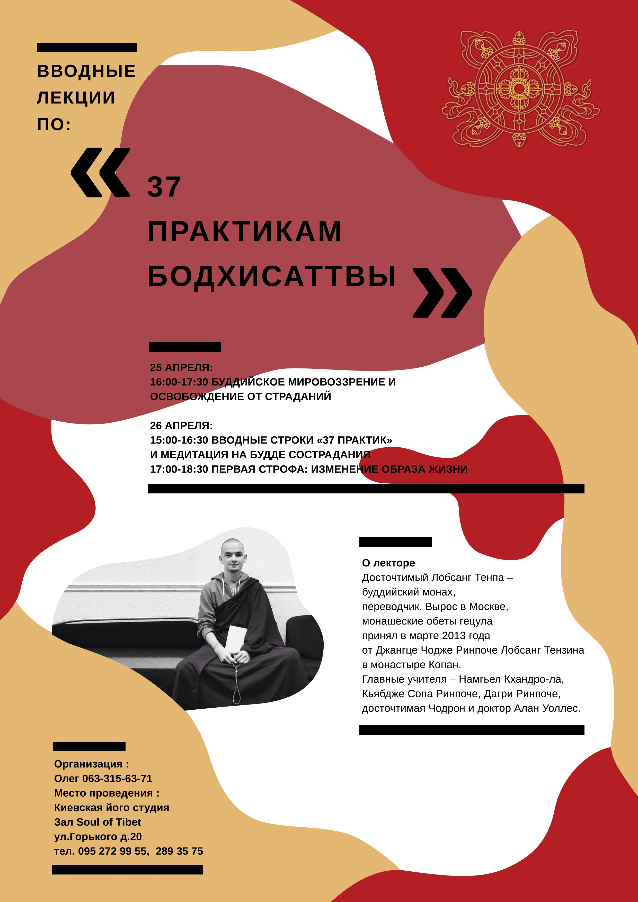 25 и 26 апреля по приглашению «Друзей Аббатства Шравасти» в Киеве буддийский монах досточтимый Лобсанг Тенпа прочтет вводные лекции по тексту «37 практик бодхисаттвы» (на основе двух книг досточтимой Тубтен Чодрон: краткой книги «Комментарий к «37 практикам» и обширной «Не верь всему, что думаешь»).